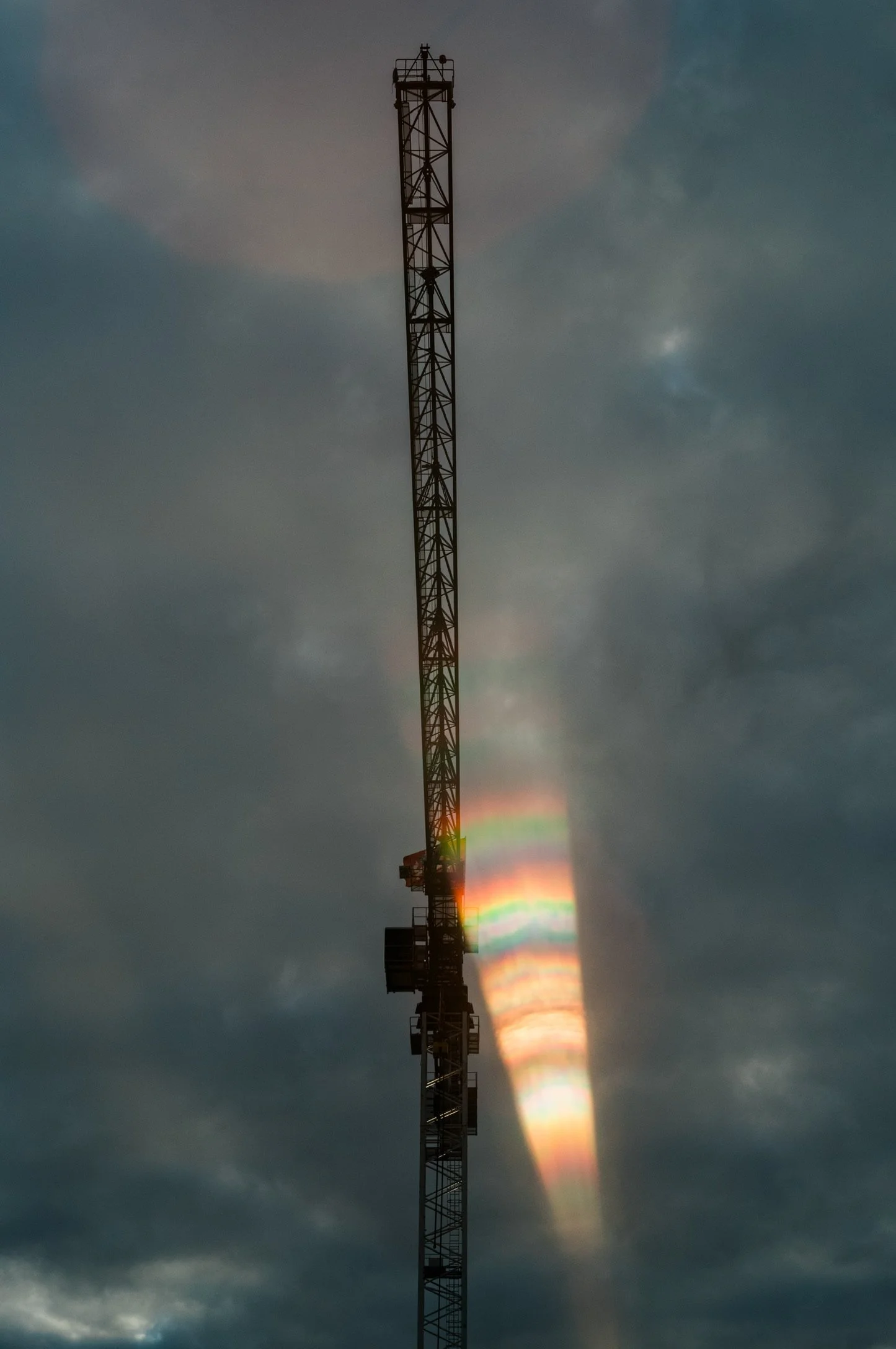 A tall construction crane with a rainbow-colored light reflection on its side, set against a cloudy sky. View fullsize